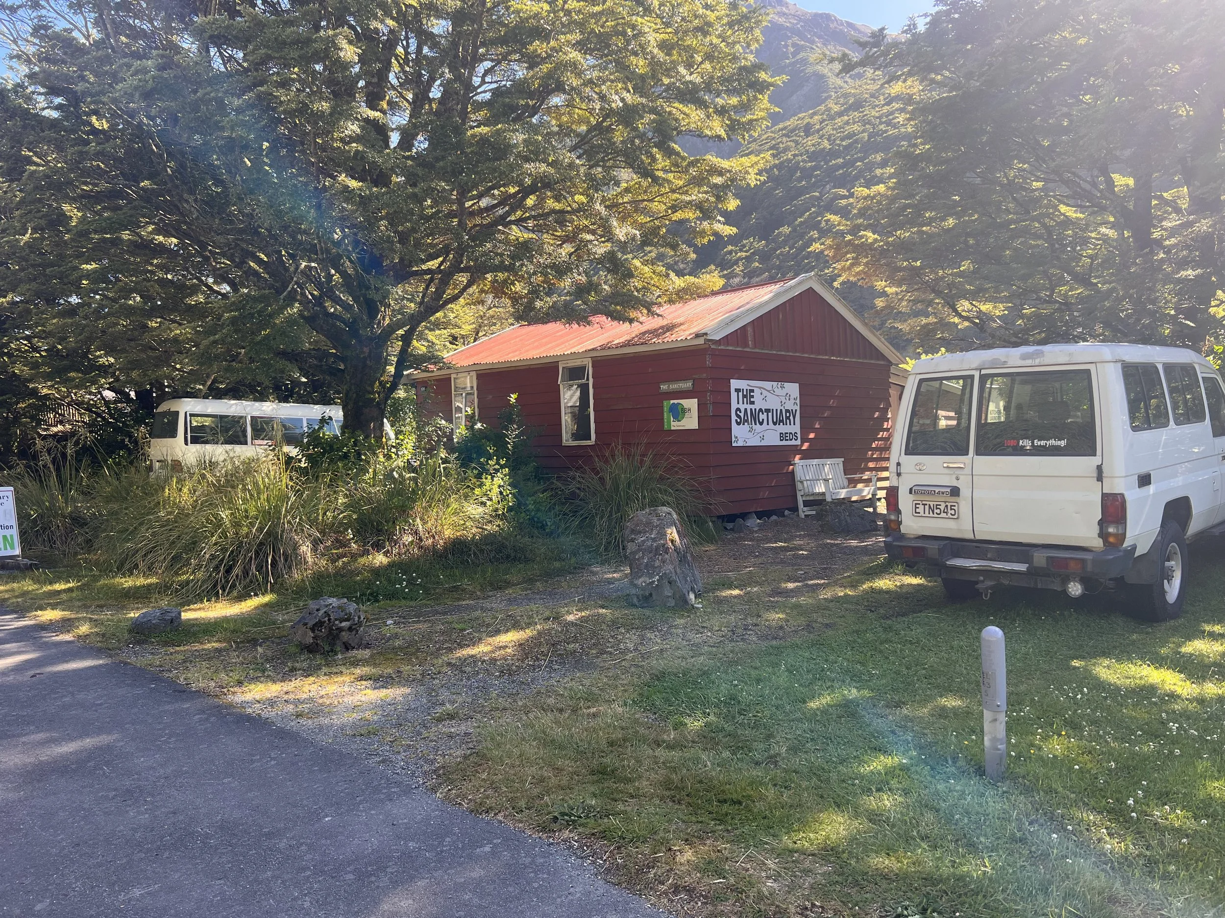 Once down by the road, I call a few accommodations in the valley but they all seem to be fully booked. We booked at The Sanctuary at Arthur’s Pass for tomorrow but now we are one day ahead of schedule. They still have one bed for tonight but not two, says Bill the friendly owner. I try another hostel but accidentally call the same number and now Bill tells me he can work something out. He even offers to pick us up. 😊