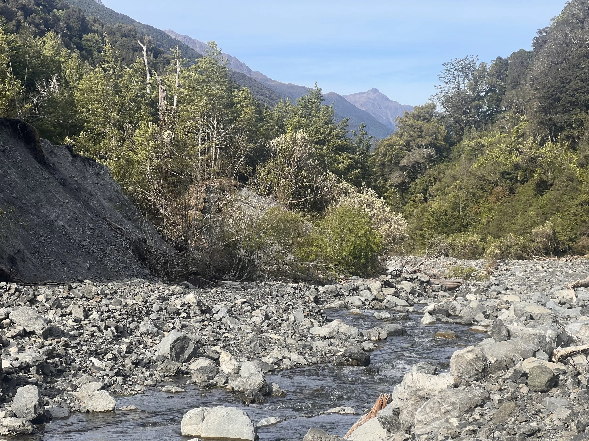 Surprise on the first few km’s in the forest: I bump into Margot, Jasper and Anouk whom I know from the North Island. They are so surprised that they almost pass me by. 😅 We have the usual chit chat. While I tell them about the nicest spots in the South, they mention some natural hot pools coming up in about two days further North. Looking forward to that! The wobbly, stoney river bed walk starts after lunch. The sun ☀️ is full on today. Good to be close to the water but few spots to find shelter. Consumption of sun screen at its maximum!
