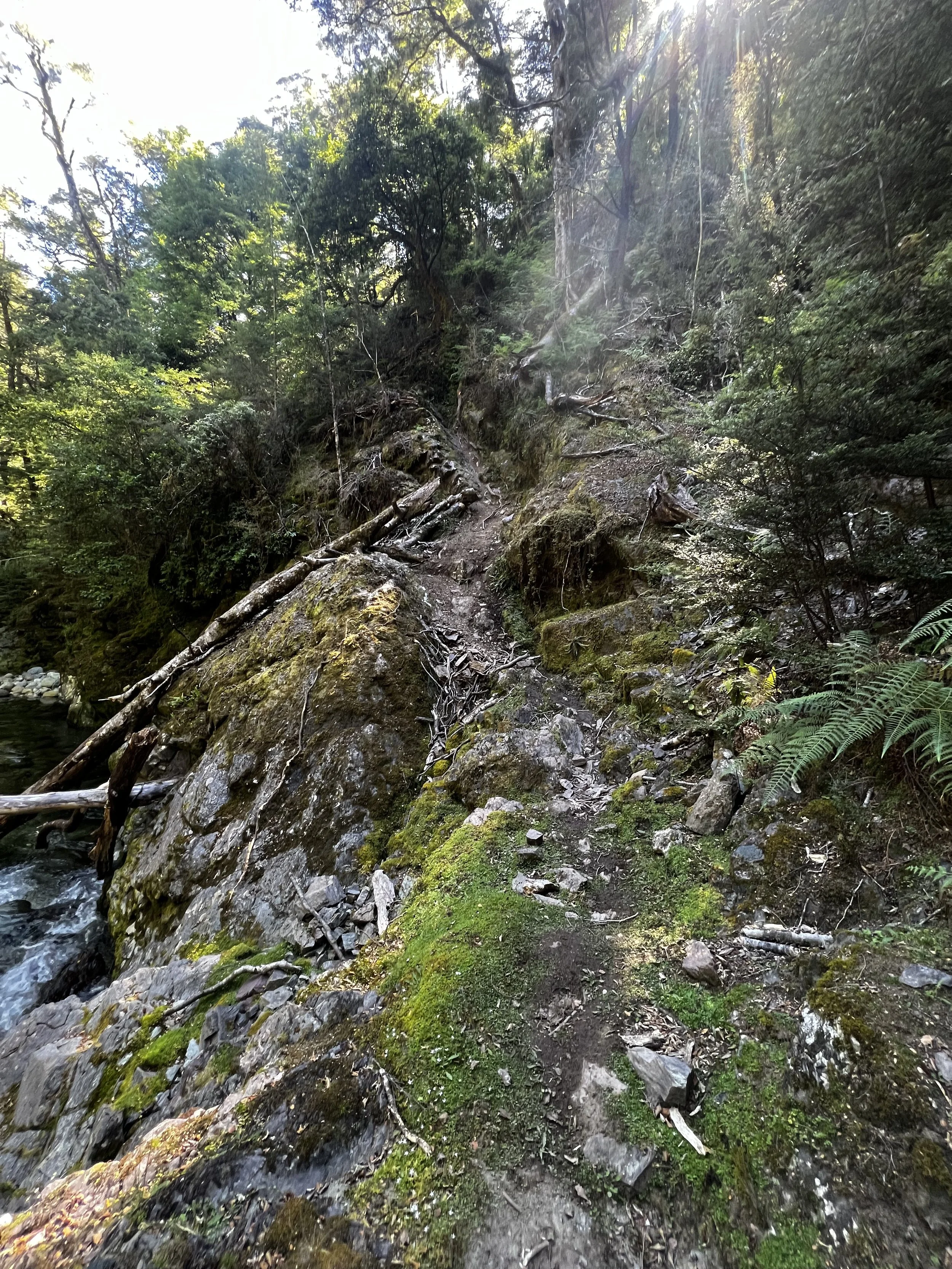 It’s very steep and I hold on to all kinds of plants and leaves in the hope that they are well rooted in the ground, if not I would directly slide down and fall into the lake. A realization that causes a big fear. Just do not panic now, I tell myself. A creek about 10 meters further left looks like a way out and once I get there, I can see that climbing up over the stones in the creek is pretty straight forward.