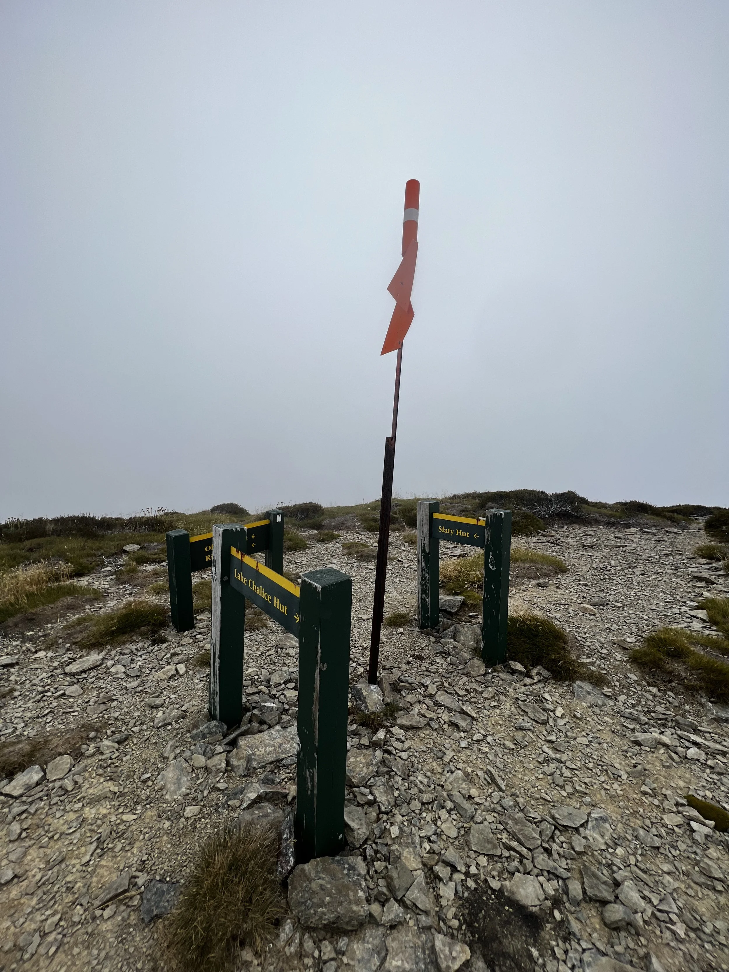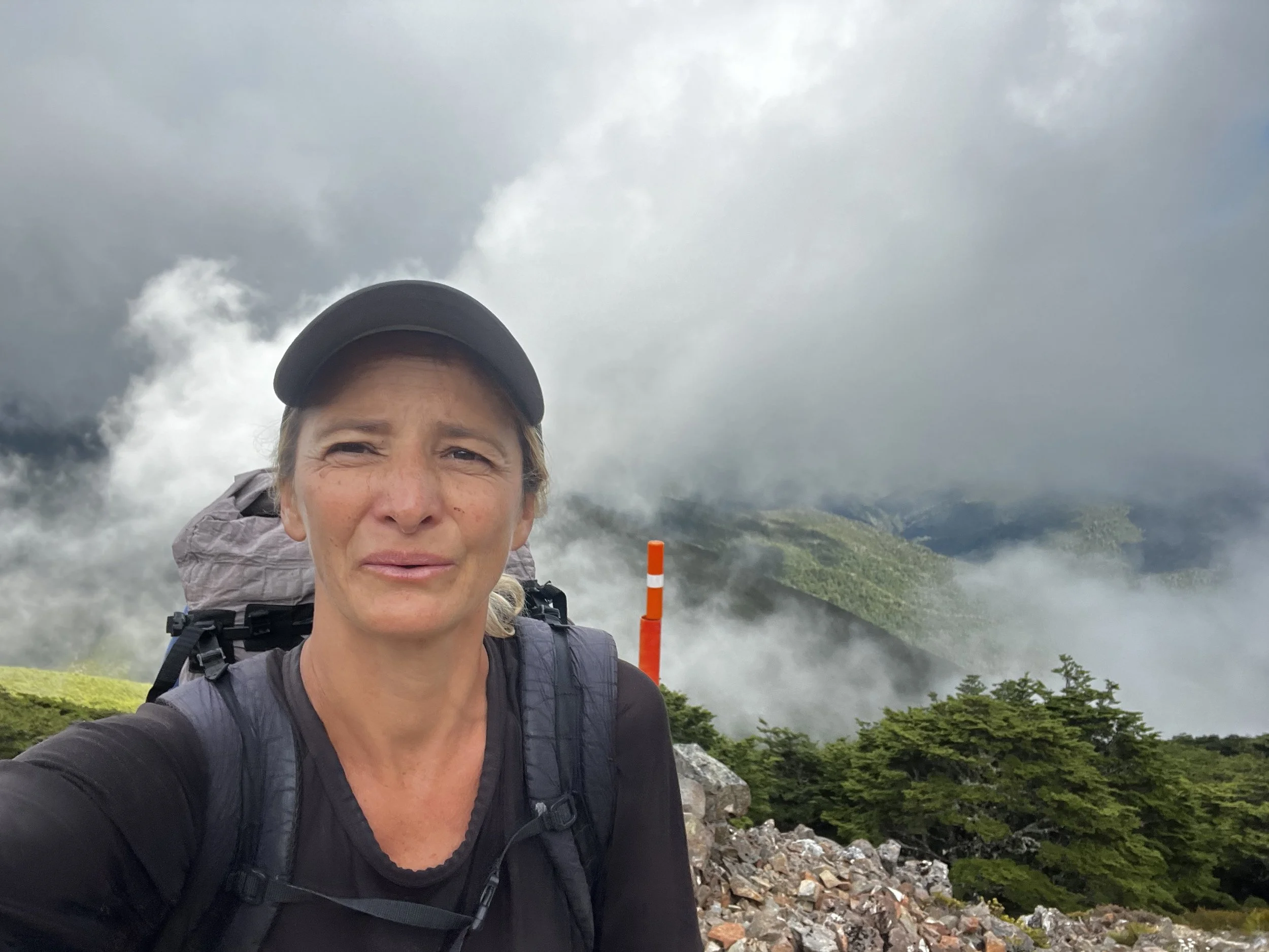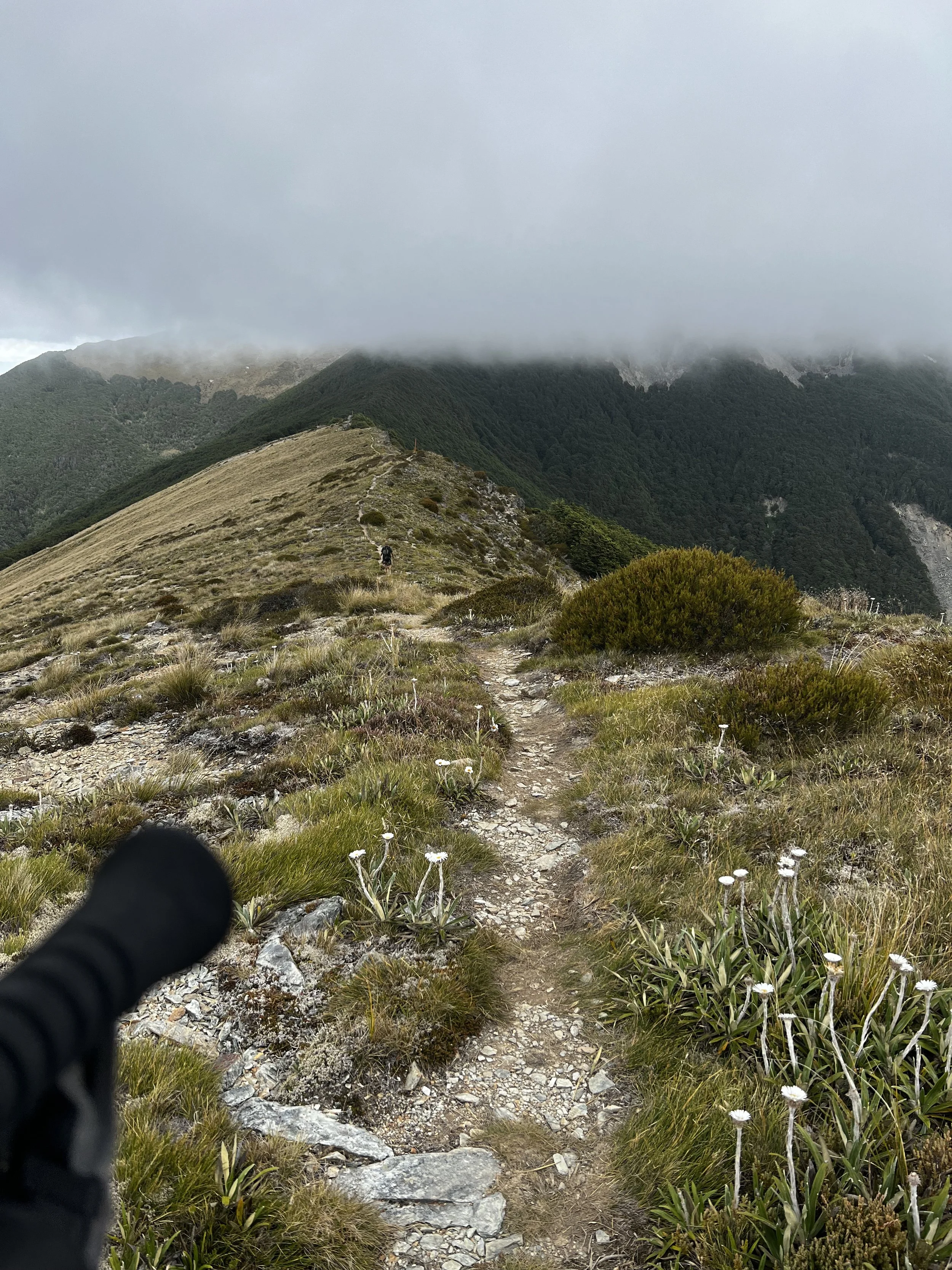 The climb up to the summit is steep but very enjoyable and much faster than I expected. It’s very rocky and above tree line, the kind of terrain I like! Unfortunately, some clouds are coming up from the valley once we are up si views are limited. There is something mystical in the air, what a great day. Full of energy up to the summit of Little Rintoul. Very technical at some spots. Exciting! It’s all white around us at that summit so we head on pretty quickly. We snack a lot on the way to Stodys Hut where we have “lunch” at 4pm.