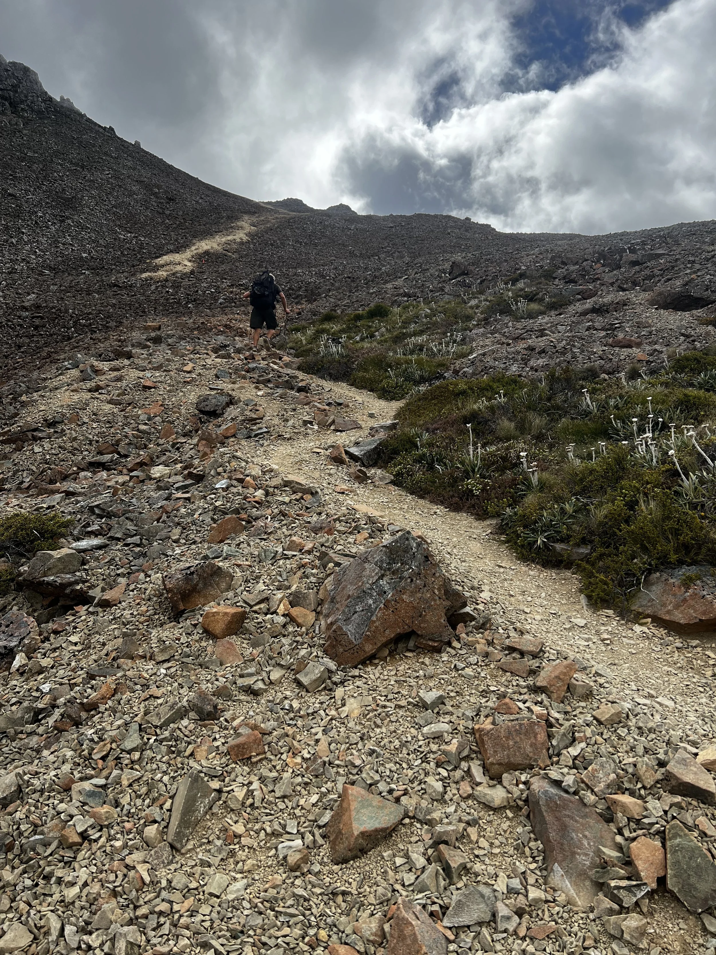 Little moving stones and almost sandy ground require many little steps in order to not slip forward or backward. The terrain is ondulating, many small climbs but nothing major all day until we reach Hunters Hut at around 4pm.