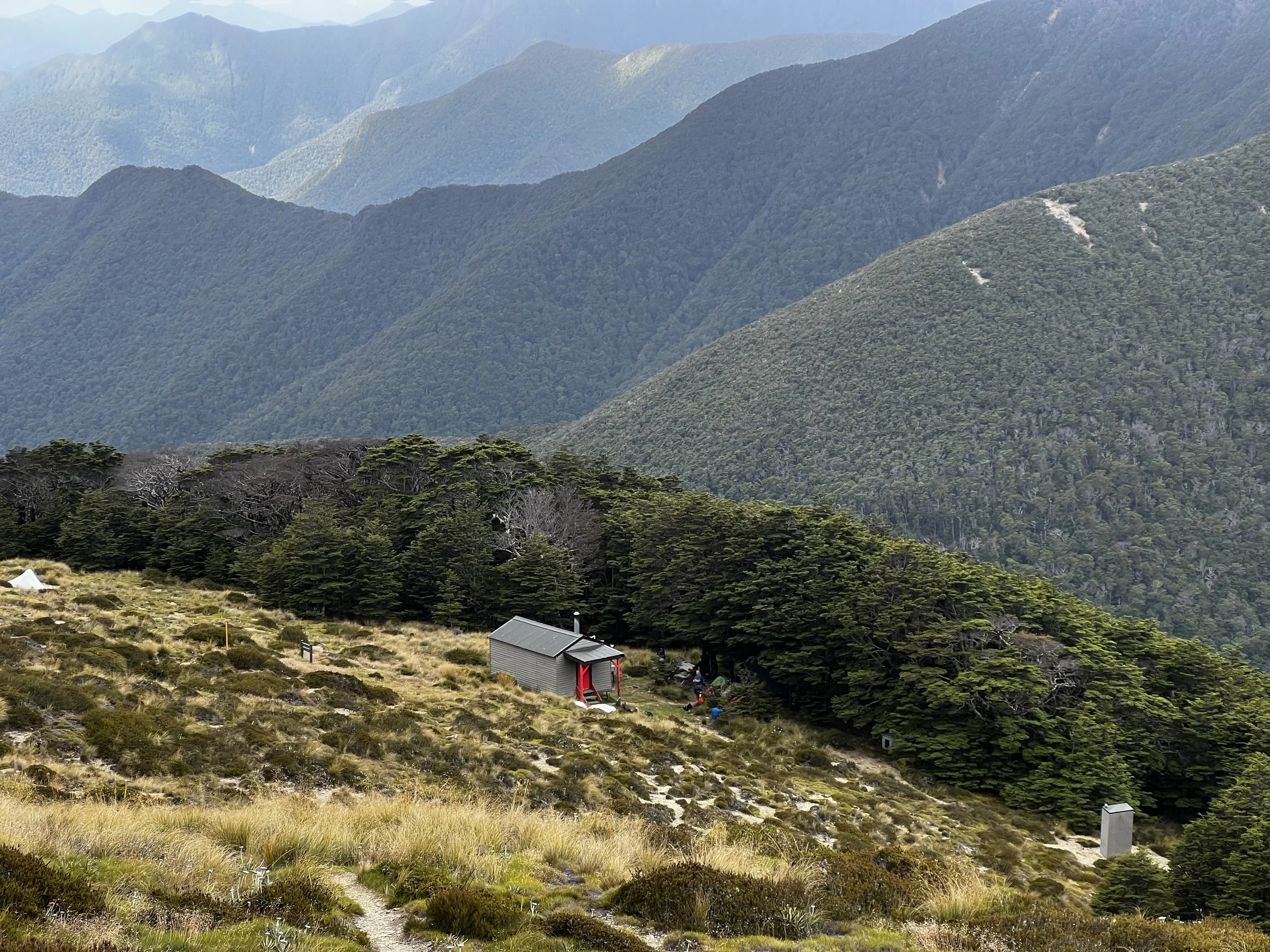 It’s a bit tempting to stay here, nice little hut with a porch all around it overlooking the surroundings but as it’s still “early” and some southbounders show us saddle we would cross (visible from the hut), I am keen on tackling that one as well.