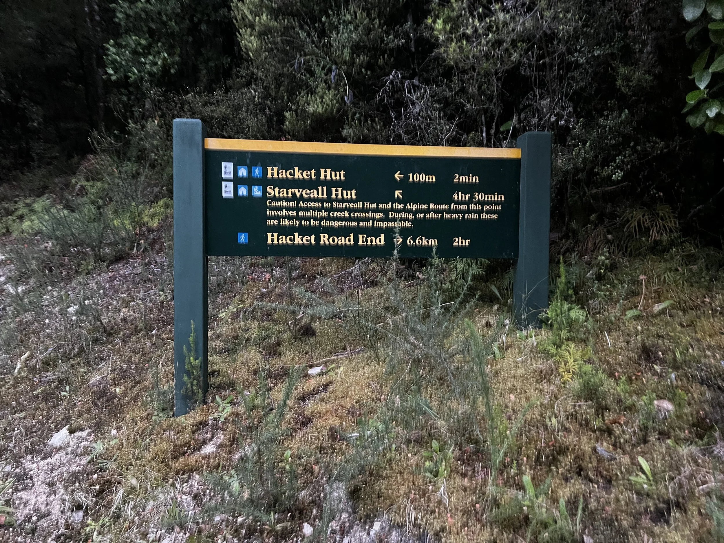 It’s only downhill from here but how is the terrain? Estimated time for arrival communicate to Mary 9.30pm just before it gets dark. I feel a bit uncomfortable and stressed but before I can think we are already running down the hill. Thigh there is still quite a few hours of sunlight it’s already darker in the forest. Just before Hacket the trail crosses the river several time. Exhausting but I am on autopilot at that point, just push through I tell myself. Then finally the hut. 6km/2 hrs to the car park as per the DOC sign. Phew! Is it really doable in 1 hour as someone at Starvall hut said? It is already 9pm but Mary said she would wait for us. We look at the map to see which way to go and start walking quickly but I soon cannot follow Phils pace anymore and loose sight.