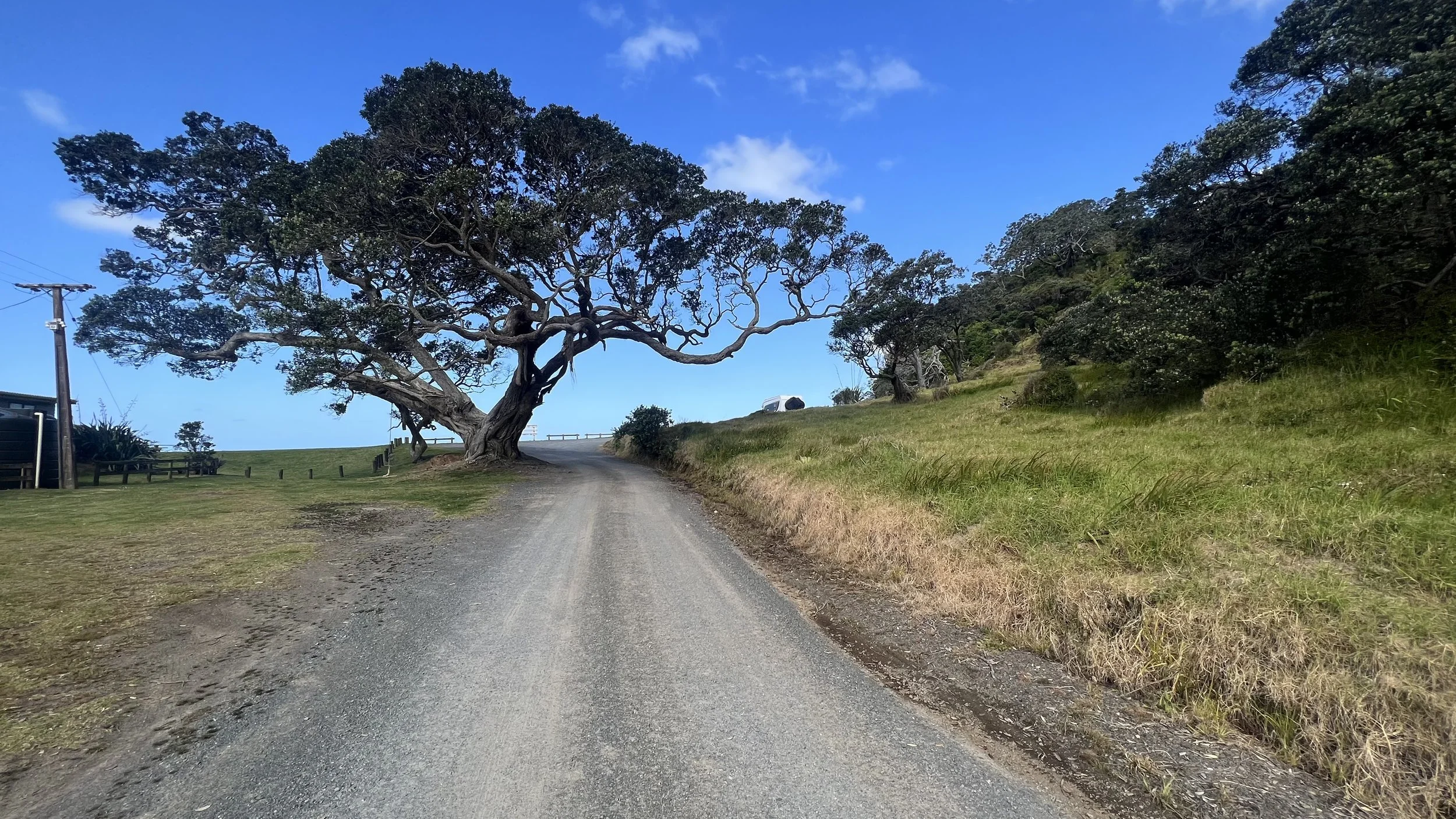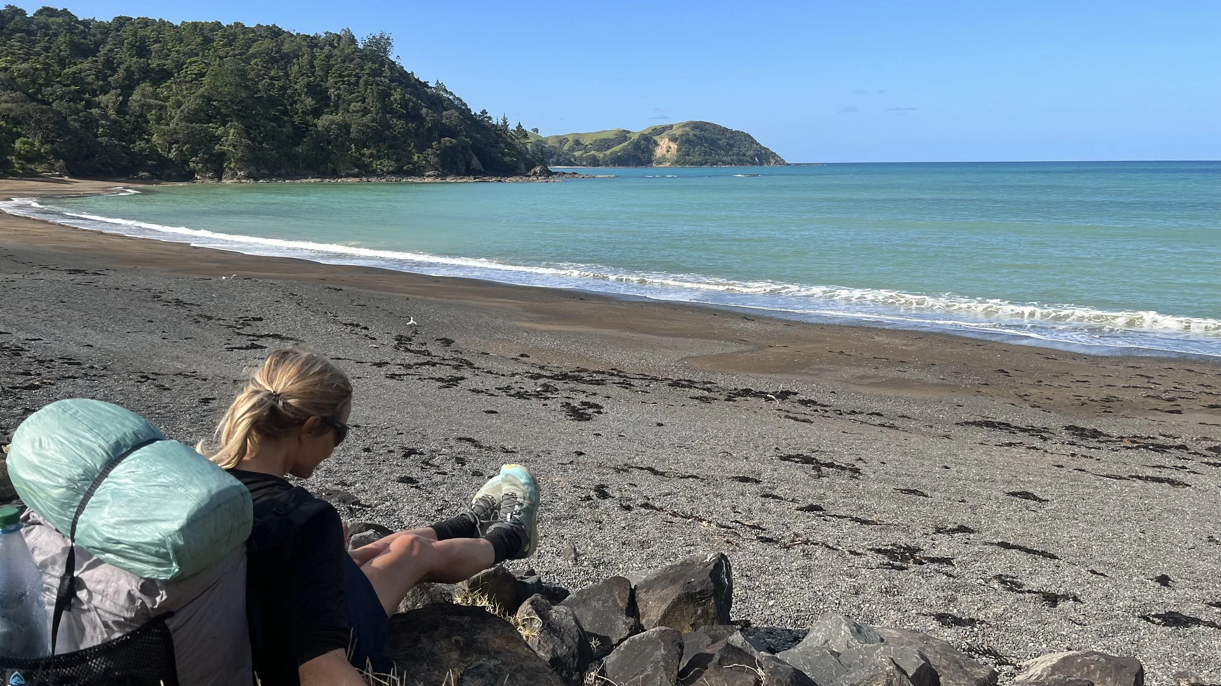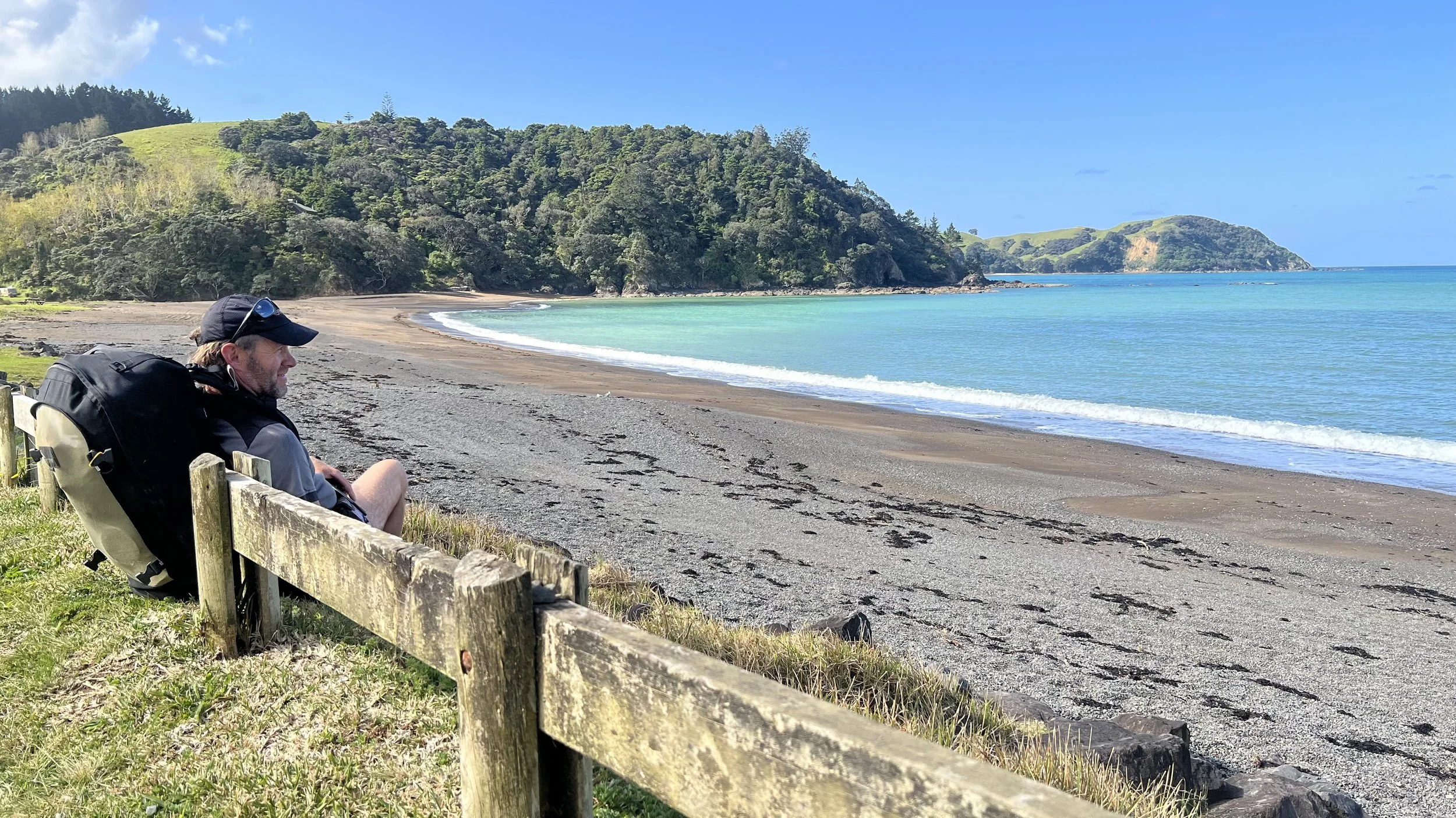 When walking on the road again during the afternoon, a car stops. An older gentleman named gets out and asks if we have a place to stay at Helena Bay, the next town, and offers us to camp in his garden with access shower and bathroom. I take down his address and phone number. Helens Bay is beautiful in town with a big beautiful big and empty beach. I stop for quite a while to listen to the waves. What a peaceful place! It looks like there is no tourism at all. Just a few houses and people living here.