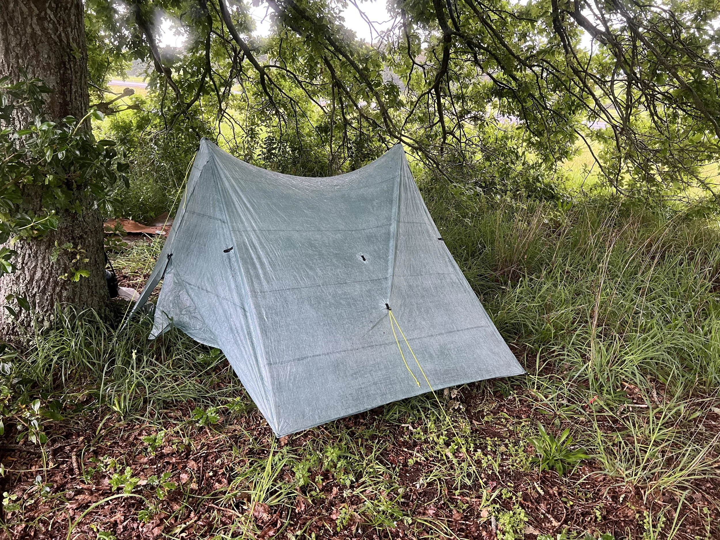 Rain kicks in around 3pm but legs feel strong and I continue walking until 6pm. The area close to the river is covered with wet grass … not a good campground. Looking out for some trees, I find a good campsite by a small forest up a hill a little bit off trail.